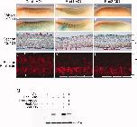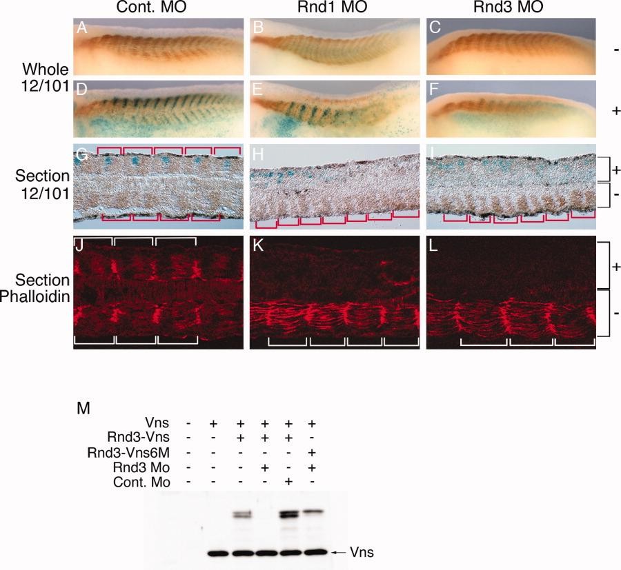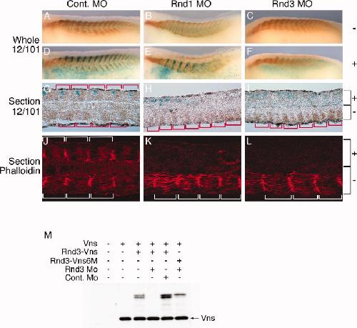 Figure 5. Gene depletion of Rnd1 and Rnd3 disrupted somite formation. A-L: Antisense morpholino oligonucleotide (MO) for control (A,D,G,J), Rnd1 (B,E,H,K), or Rnd3 (C,F,I,L) was injected on one side of the four-cell stage embryos with nlacZ mRNA. At tail bud stage, all embryos were stained in blue with X-gal. A-F: Embryos were stained in whole-mount with monoclonal 12/101 antibody. A-F: Lateral views of noninjected side (A-C) and MO plus nlacZ injected side (D-F) are shown. G-I: Embryos were stained in longitudinal tissue section with monoclonal 12/101 antibody. Red brackets show each somitic unit. J-L: Embryos were stained in longitudinal tissue section with phalloidin. White brackets show each somitic unit. All images are positioned with anterior to the left. G-L: MO plus nlacZ injected side to the top and noninjected side to the bottom (indicated by + and -, respectively), and dorsal views are shown. M: The effect of Rnd3 MO on Rnd3 mRNA transcription was tested with in vitro transcription/translation system. Rnd3 MO inhibited the Rnd3-Vns transcription constructed to generate a fusion protein with eYFP (Vns) specifically, but not inhibited a rescue construct Rnd3-Vns6M. Vns was used as loading control.