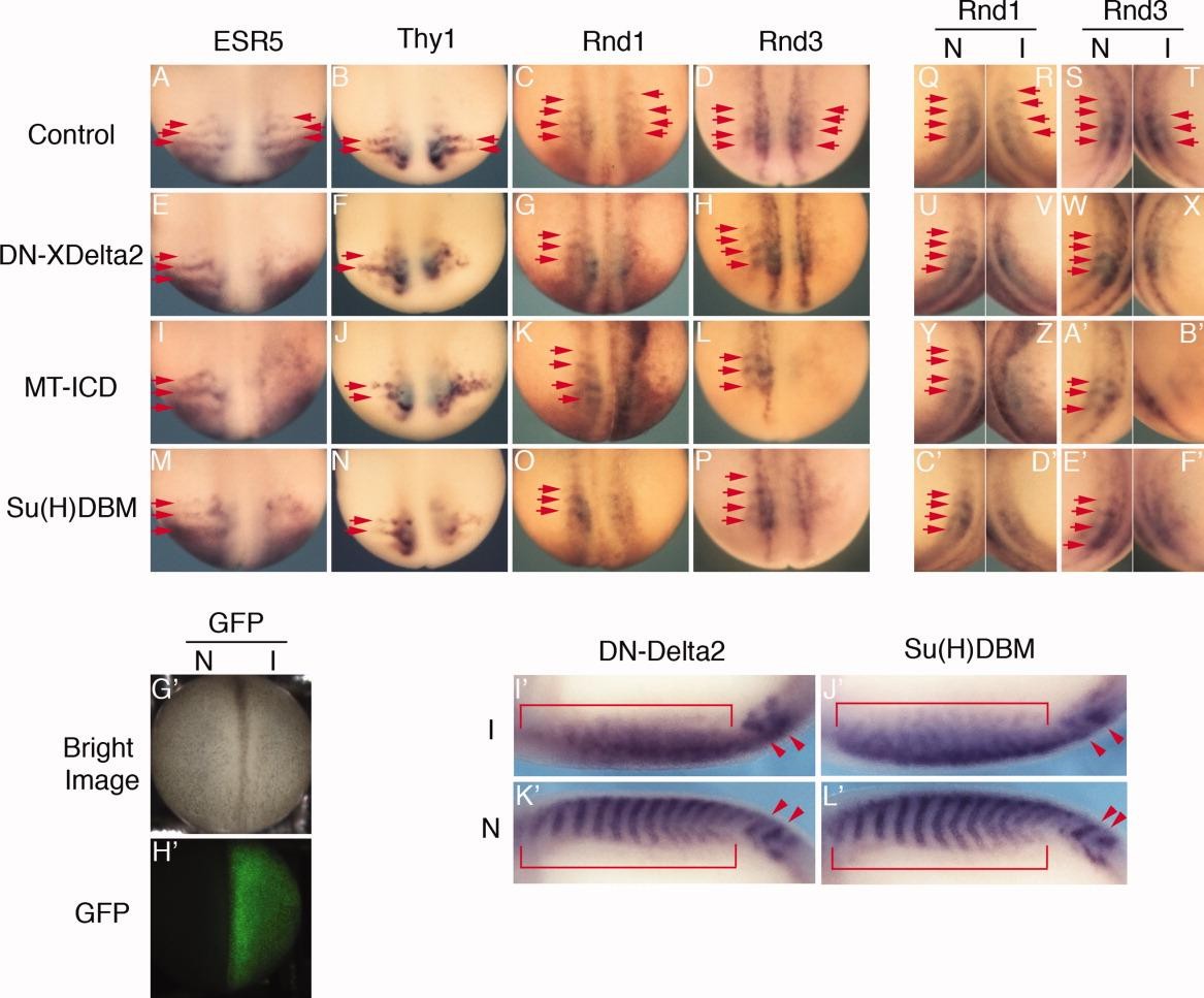 Figure 3. Disruption of Rnd1 and Rnd3 expression patterns by overexpression of dominant-negative or active form of Notch signal genes. A-L prime : Water (A-D,Q-T), mRNA of (E-H,U-X,I prime ,K prime ) DN-XDelta2, (I-L,Y-B prime ) MT-ICD, or (M-P,C prime -F prime ,J prime ,L prime ) Su(H)DBM was injected on one side of the four-cell stage embryos with green fluorescent protein (GFP) mRNA for tracer. At the neurula stage (A-F prime ) or tail bud stage (I prime -L prime ), GFP signal was observed in the injected embryos as a lineage trace (G prime ,H prime ), and stained in whole-mount for the expression of ESR5 (A,E,I,M), Thy1 (B,F,J,N), Rnd1 (C,G,K,O,Q,R,U,V,Y,Z,C prime ,D prime ), and Rnd3 (D,H,L,P,S,T,W,X,A prime ,B prime ,E prime ,F prime ,I prime -L prime ). Red arrows show gene expression domains (A-E prime ), and red brackets or arrowheads show Rnd3 expression domains in somite or presomitic mesoderm (PSM), respectively (I prime -L prime ). A-P: Embryos are oriented with anterior to the top, and dorsal views are shown. Left: Noninjected; right: injected side of mRNAs. Q-F prime : Embryos are oriented with anterior to the top, dorsal to the right (Q,S,U,W,Y,A prime ,C prime ,E prime ) or left (R,T,V,X,Z,B prime ,D prime F prime ), and lateral views are shown. I prime -L prime : Embryos are oriented with anterior to the left, dorsal to the top (K prime ,L prime ) or bottom (I prime ,J prime ), and lateral views are shown. N: noninjected; I: injected side of mRNAs.
