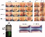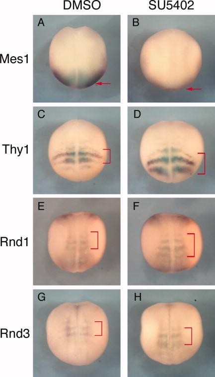 Figure 4. Posteriorly shift of Rnd1 and Rnd3 expression domains by fibroblast growth factor (FGF) inhibitor SU5402. A-H: Stage 14 embryos were incubated with (B,D,F,H) or without (A,C,E,G) 50 mu M SU5402 for 3.5 hr, and stained in whole-mount for the expression of Mes1 (A,B), Thy1 (C,D), Rnd1 (E,F), and Rnd3 (G,H). Red arrows or brackets show expression of genes indicated. All embryos are oriented with anterior to the top, and dorsal views are shown.