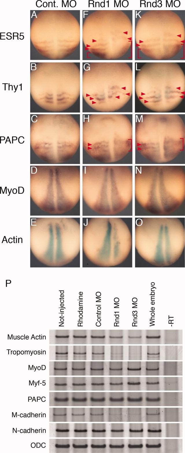 Figure 6. Expression patterns and levels of segmentation clock- and somite differentiation-related genes in Rnd1 or Rnd3 morpholino oligonucleotide (MO) injected embryos. A-O: Control (A-E), Rnd1 (F-J), or Rnd3 (K-O) MO was injected on one side of the four-cell stage embryos with green fluorescent protein (GFP) mRNA. Neurula stage embryos were stained in whole-mount for the expression of ESR5 (A,F,K), Thy1 (B,G,L), PAPC (C,H,M), MyoD (D,I,N), and actin (E,J,O). Red arrowheads or brackets show striped or nonstriped domains of each gene expression, respectively. All images are positioned with anterior to the top, MO and GFP mRNA injected side to the right, and dorsal views are shown. P: Embryos injected with control, Rnd1, or Rnd3 MO were analyzed by reverse transcriptase-polymerase chain reaction (RT-PCR) for gene expression levels indicated at the left column. OCD was used as loading control. Rhodamine was injected in embryos with MOs as a lineage trace. -RT, without reverse transcriptase.