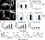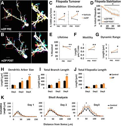 Figure 3. ZIP destabilizes dendritic filopodia and promotes arbor extension. A, B, Overlay of six successive images at 10 min of a GFP neuron before (A) and 4 h after mZIP treatment (B). White portions of the arbor are stable, and colored portions are dynamic over 1 h imaging period. The area within the boxed region is enlarged on the right. Scale bar, 20 μm. CâG, Morphometric analysis of dendritic filopodial dynamics of neurons before and after mZIP delivery to tectum (N = 5 cells; n = 213 filopodia for PRE and 215 filopodia for POST) and vehicle (N = 5 cells; n = 221 filopodia for PRE and 210 filopodia for POST). mZIP treatment significantly increases the rates of filopodial addition and elimination (C), decreases the proportion of stabilized pre-existing filopodia (D) and mean filopodial lifetime (E); increases the filopodial motility (F) and dynamic range (G). HâK, 3D morphometric analysis of tectal neurons labeled with Alexa Fluor 488 dye alone (control, n = 12) and with ZIP (n = 13) 1â3 d after electroporation. ZIP increases total dendritic arbor size (H) and branch length (I) but not total filopodial length (J). K, 3D Sholl analysis of dendritic arbor complexity 1â3 d after electroporation. *p < 0.05; **p < 0.01.