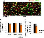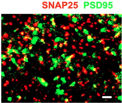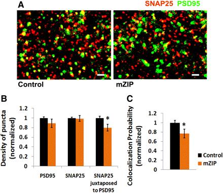 Immunostaining of the tectal neuropil from a horizontal brain section with antibodiy against SNAP-25 (red) and PSD-95 [dlg4] (green) 4 h after tectal infusion of mZIP [a cell-permeable myristoylated-PKMz inhibitor peptide]. Yellow puncta represent the overlap of SNAP-25 and PSD-95 puncta. Scale bars, 1 um.