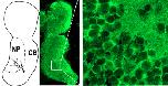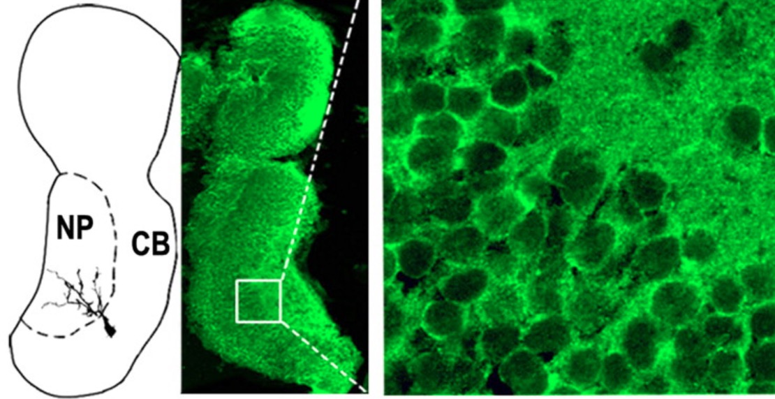 Schematic drawing of NF stage 47 tadpolebrain (left) and horizontal section stained with PKMz [now known as prkcz] antibody demonstrating enriched immunoreactivity in the neuropil region (NP) and the membrane portion of cell body (CB) region of the optic tectum.