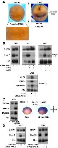 Fig.6. Induction of Nkx2.5 by FGF is mediated by p38MAPK and not by ERKMAPK. (A) DMZ explants (n = 36) were dissected and at stage 11 were cultured in SU 5402 (30 μM) and allowed to develop to stage 16. Half of the explants were used to extract RNA for RT-PCR analysis (left) and the rest were used to extract proteins for Western analysis (right). (B) DMZ explants were cultured and processed as above, except their incubation in U0126 (30 μM). (C) DMZ explants were cultured and processed as above, except their incubation in SB203580 (30 μM). (D) Transcripts encoding FGF8 were injected and VMZ explants (n = 36) were dissected and gown from stages 11 to 15 in the absence or presence of SB203580 (30 μM). Half of the explants were used to extract RNA for RT-PCR analysis (left) and the rest were used to extract proteins for Western analysis (right). (E) Different combinations of transcripts encoding FGF8 and CREB AMO were injected to embryos, and VMZ explants were dissected at stage 10+. RNA was extracted at stage 15 and RT-PCR analysis was performed.
