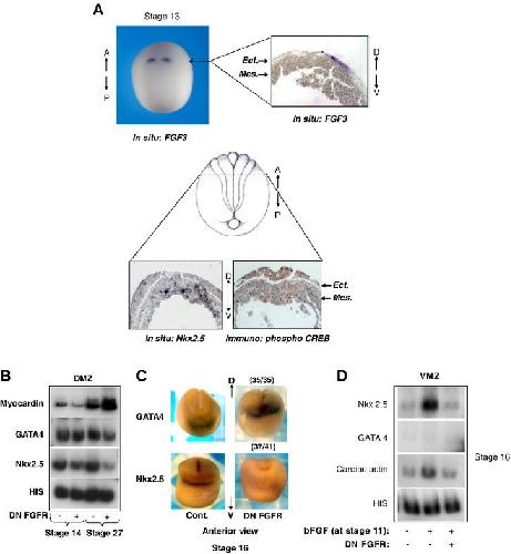 Fig. 4. FGF induces Nkx2.5 gene expression without affecting GATA4 gene expression. (A) Expression of FGF3 was detected on stage 13 embryos by whole-mount in situ hybridization (n = 20) (left). Stained embryos were transversely sectioned at the stained plane. One section is presented (right). Anterior transverse sections in stage 13 embryos followed by in situ staining with a probe to Nkx2.5. Nkx2.5 is expressed in lateralmesoderm of anterior section (bottom left). Adjacent sections immunostained with antibodies to phospho-CREB (S133). Red dots represent nuclear phospho-CREB staining. The embryo scheme indicates the plane section. (B) Transcripts encoding truncated FGF receptor (DN FGFR) were injected to embryos and DMZ explants (n = 36) were isolated and grown to stages 14 and 27. Total RNA was extracted and RT-PCR analysis was performed. (C) Transcripts encoding DN FGFR were injected to one cell embryos and the expression of GATA4 and Nkx2.5 was analyzed by in situ hybridization of stage 16 embryos. (D) VMZ explants were dissected from embryos injected with transcripts encoding DN FGFR or from control embryos. At stage 11, basic FGF (150 ng/ml) was added and explants were grown to stage 16. Total RNA was extracted and RT-PCR analysis was performed.