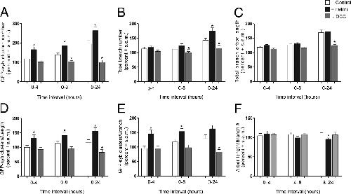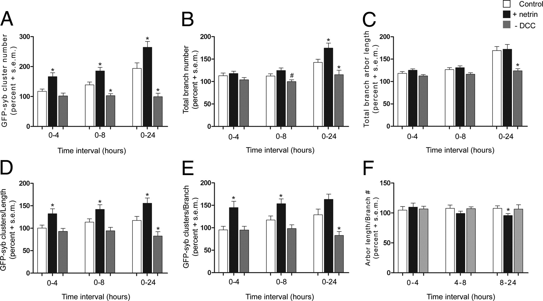 Figure 4. DCC-mediated netrin signaling contributes to RGC axon presynaptic differentiation during the development of retinotectal connectivity. Changes in RGC presynaptic differentiation and in axon arborization were measured and expressed as percentage of initial values for each individual axon. A, Microinjection of recombinant netrin-1 into the optic tectum induced a significant increase in GFP-synaptobrevin-labeled presynaptic sites when compared with controls over a 24 h observation period. In contrast, microinjection of DCC function-blocking antibodies prevented the normal increase in presynaptic site number observed in controls over the 24 h observation period. B, Even though netrin induces a significant net increase in branches 8 h after treatment (Fig. 3C), the increase in branch number in RGC axons in netrin-treated tadpoles relative to the initial branch number was significantly different from controls by 24 h only. In contrast, anti-DCC treatment prevented the increase in branch number observed in controls at 8 and 24 h. C, The effect of anti-DCC treatment on axon arbor growth is also demonstrated by measuring the change in total arbor branch length. Total arbor branch length in RGC axons increased by 24 h in both control and netrin-treated tadpoles, whereas this measure was unchanged in the anti-DCC-treated tadpoles. D, E, The number of GFP-synaptobrevin-labeled presynaptic sites per unit arbor length and per branch number provided a measure of presynaptic site density. Netrin treatment significantly increased presynaptic site density in RGC axons from 4 h onward, whereas anti-DCC treatment resulted in RGC axons with lower presynaptic site density relative to controls by 24 h. F, We obtained a comparative measure of branch length by calculating average axon segment length (length/branch) at each observation interval and expressing it as percentage of initial value for each axon. This measure revealed that, on average, axon branch segments in RGC axon arbors in netrin-treated tadpoles became shorter than controls from 8 to 24 h after treatment. *Significance with p ≤ 0.05. #Trend toward significance with 0.05 > p < 0.10. Error bars indicate SEM. |