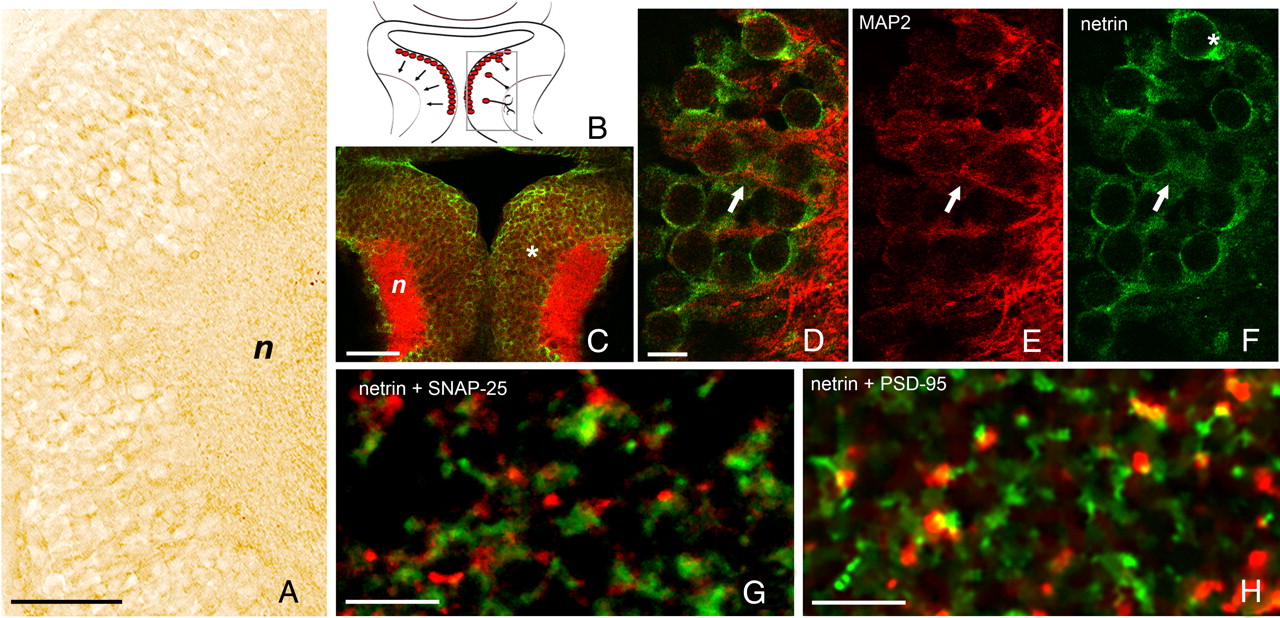 Figure 1. Netrin is present in tectal neurons and is identified at synaptic sites in the stage 44â45 Xenopus optic tectum. A, B, Localization of netrin immunoreactivity in the tectal midbrain. B, Schematic diagram of a stage 44â45 Xenopus tectal midbrain (horizontal view). Neuronal precursors, born in rows adjacent to the ventricle in the right and left sides of the optic tectum, follow a lateral and rostral migratory path while extending a primary dendrite that will eventually terminate in the tectal neuropil and begin to elaborate a dendritic arbor. In this diagram, the boxed region corresponds to the micrograph shown in A. A, This horizontal view of the optic tectum demonstrates that a large, evenly distributed subset of cells is immunopositive for netrin-1. Punctate immunostaining is also observed throughout the tectal neuropil (n). CâF, Confocal micrographs of a horizontal section through the stage 44â45 Xenopus optic tectum coimmunostained with antibodies to netrin (green immunofluorescence) and the dendritic marker MAP2 (red immunofluorescence). C, Note that MAP2 immunostaining identifies optic tectal neuron dendritic processes projecting to and branching in the tectal neuropil (n). DâF, The high-magnification confocal image reveals that netrin immunoreactivity is localized to cell bodies (asterisk) and proximal dendrites (arrow) of neurons within the medial portion of the optic tectum that are also immunoreactive for MAP2. G, Confocal micrograph of the tectal neuropil in stage 44â45 Xenopus optic tectum coimmunostained with antibodies to netrin (red immunofluorescence) and the presynaptic marker SNAP-25 (green immunofluorescence). Note the punctate distribution of netrin (red) and SNAP-25 (green) in the tectal neuropil; the netrin-immunoreactive puncta are in direct apposition to SNAP-25-labeled presynaptic sites. H, Confocal micrograph of stage 44â45 Xenopus optic tectum coimmunostained with antibodies to netrin (red immunofluorescence) and the postsynaptic marker, PSD-95 (green immunofluorescence). Netrin-immunoreactive puncta in the tectal neuropil colabel with PSD-95-positive postsynaptic densities. Scale bars: A, 50 μm; C, 100 μm; DâF, 10 μm; G, H, 5 μm. |
