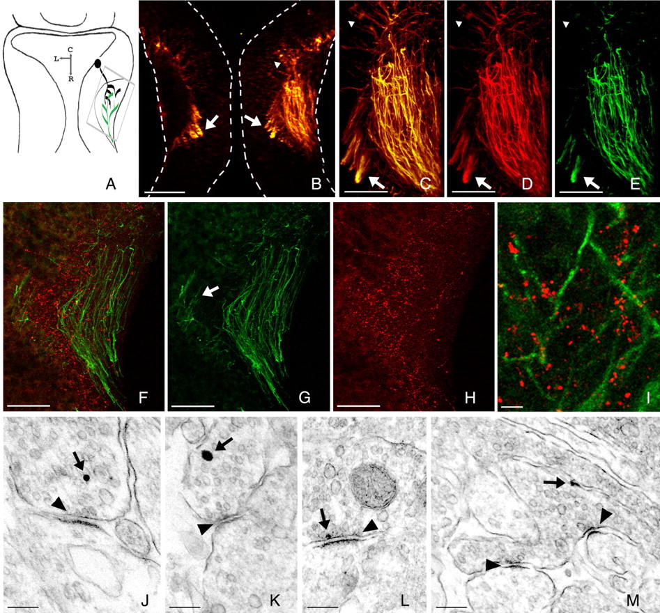 Figure 2. RGC axons branching the optic tectum are immunopositive for DCC at presynaptic sites. A, Schematic illustration of the retinotectal circuit in stage 44–45 Xenopus optic tectum (horizontal view). RGC axons project to the neuropil in the lateral tectum, in which they elaborate an arbor and form synapses with tectal neuron dendrites. Confocal micrographs of the tectal neuropil shown in C–H correspond to regions demarcated by the gray box. B–E, After unilateral right eye ablation, sections through the tectal midbrain were coimmunostained with antibodies to DCC and a marker for RGC axons (neurofilament-associated protein, 3A10). B, Horizontal section showing the localization of 3A10 (red)- and DCC (green)-immunoreactive fiber bundles in the two sides of the tectal neuropil. A large bundle of double-labeled fibers in the right side of the optic tectum is absent from the left side, which normally would receive innervation from the right, ablated eye. This manipulation identifies the missing axonal fibers as RGC axons. Note that a smaller, more medial population of DCC-positive fibers remains intact after eye ablation (B–E, G, arrows), indicating the presence of a distinct population of DCC-positive fibers in addition to RGCs. C–E, High-power micrographs of the RGC axon bundle shown in B illustrates the colocalization of DCC (green) and 3A10 (red) immunoreactivities in the axonal fibers [double labeling (C); 3A10 immunoreactivity alone (D); DCC labeling alone (E)]. A high degree of colocalization in DCC and 3A10 immunoreactivity in RGC axons is observed. Note, however, that a small subset of cell bodies and their dendrites are also positive for 3A10 but negative for DCC (B–E, small arrowheads). F–I, Micrographs of stage 44–45 Xenopus tectal neuropil coimmunostained with antibodies to DCC and netrin. DCC immunoreactivity (green) localizes to RGC axonal fibers projecting and branching in the tectal neuropil. Netrin immunoreactivity (red) is distributed in a punctate pattern in the tectal neuropil, in close proximity to DCC-positive axon fibers. I, Higher power micrograph of the horizontal section shown in F better illustrates how the netrin-immunoreactive puncta (red) are in close apposition to DCC-positive fibers (green). J–M, The subcellular localization of DCC in stage 44–45 optic tectum was determined by preembedding immunoelectron microscopy. The silver enhancement of secondary antibody-conjugated 1 nm gold particles shows that DCC immunoreactivity localizes to vesicles at presynaptic specializations (J, K, arrows), as well as presynaptic membranes (L, arrow) in the tectal neuropil. The presence of a synapse is indicated by the arrowheads. M, Discrete silver-enhanced DCC-immunoreactive clusters were also observed on presynaptic filopodia (arrow). Scale bars: B, 100 μm; C–E, 50 μm; I, 5 μm; J, K, 0.2 μm. |