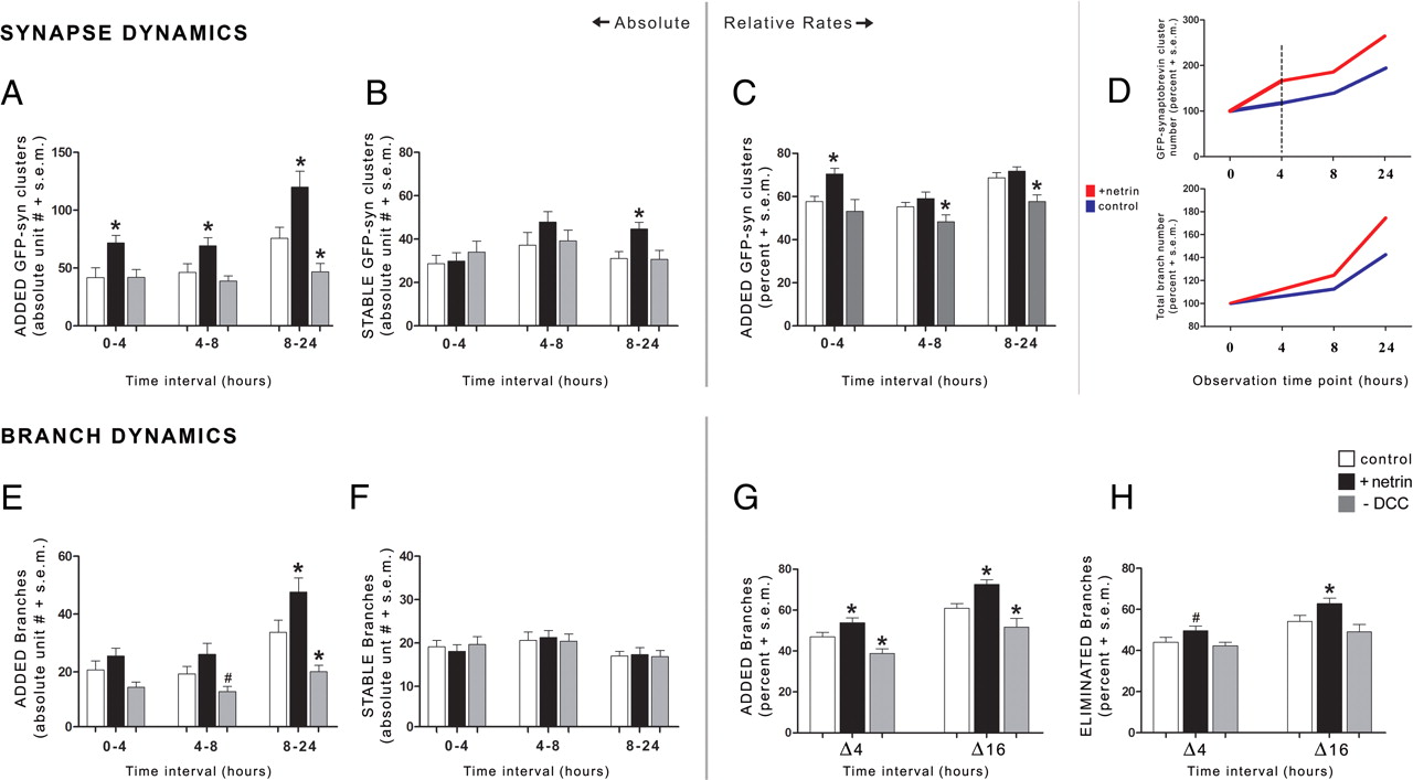 Figure 5. Perturbations in netrin signaling alter presynaptic site and axon branch dynamics. A–D, Netrin and anti-DCC influence presynaptic site dynamics. A, The number of GFP-synaptobrevin-labeled presynaptic sites added was significantly higher in RGCs axons in tadpoles treated with netrin-1 at all observation intervals (y-axis; absolute values). The number of newly added GFP-synaptobrevin-labeled presynaptic sites, however, was decreased after anti-DCC treatment, an effect that became significant in the 8–24 h observation interval. B, A small and gradual increase in the number of stabilized presynaptic clusters was observed after netrin treatment, with the number of stabilized presynaptic sites becoming significantly higher than controls in the 8–24 h interval. C, When expressed as percentage of initial value, the number of presynaptic clusters added after netrin treatment was significantly different from controls at the 0–4 h observation interval only. This suggests that the rate of presynaptic cluster addition was rapidly increased after netrin treatment, to then be maintained at a rate that matched controls. In contrast, when compared with its initial value (percentage of total), the number of presynaptic clusters added was significantly lower in RGC axons in anti-DCC-treated tadpoles both at 4–8 and 8–24 h when compared with controls. Anti-DCC had no effect, however, on the number of GFP-synaptobrevin clusters stabilized (B). D, The rates of increase in total presynaptic site (top), and branch number (bottom), in RGC axons treated with netrin (red) relative to controls (green) are also illustrated by the line graphs. E–H, Netrin and DCC influence branch addition but not stabilization. E, Netrin-1 increased the number of branches added throughout the imaging period, an effect that was significant from 8 to 24 h. The number of branches added in RGC axons in tadpoles treated with anti-DCC, in contrast, was significantly lower at the 8–24 h observation interval when compared with controls. F, Netrin and anti-DCC did not alter the number of branches stabilized. G, H, The rates of branch addition (G), and elimination (H), were significantly higher at all observation intervals after netrin treatment and, conversely, the rates of branch addition were significantly lower after anti-DCC treatment when compared with controls (Δ4 h: 0–4 h, 4–8 h data combined). Anti-DCC did not affect the rate of branch elimination (H). *Significance with p ≤ 0.05. #Trend toward significance with 0.05 > p < 0.10. Error bars indicate SEM. |