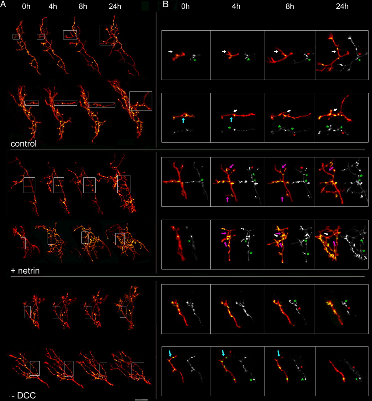 Figure 6. Dynamic changes in presynaptic structure in RGC axon arbors in response to alterations in netrin signaling. A, Confocal projections of representative RGC axons coexpressing Ds-Red (red) and GFP-synaptobrevin (green) in tadpoles microinjected with netrin-1 (+ netrin) or DCC function-blocking antibodies (− DCC) right after the first imaging session. Note the significantly higher number of GFP-synaptobrevin-labeled presynaptic sites in the morphologically more complex arbors after netrin treatment. In contrast, the RGC axon arbors that received anti-DCC treatment did not change their morphology or presynaptic connectivity significantly within a 24 h period (Fig. 7). Scale bar, 50 μm. B, Enlarged projections of single branches for the sample control-, netrin-, and anti-DCC-treated axons shown in A (gray boxes) illustrate branch and presynaptic site dynamics. Sample branches that were added (white arrows), eliminated (blue arrows), or added and then eliminated (magenta arrows) are shown for each experimental group. More branches were added and then eliminated (magenta arrows) in RGC arbors of netrin-treated tadpoles compared with controls. Although fewer in number, newly added branches in controls tended to remain stable for the remainder of the observation period (white arrows). Preexisting branches were eliminated (blue arrows) after anti-DCC treatment, whereas no new branches were added during the 24 h observation period. Sample GFP-synaptobrevin puncta added (green asterisks) or eliminated (red asterisks) highlight presynaptic site dynamics in the individual axon branches. Note that more GFP-synaptobrevin puncta were added per axon branch within the first 4 h after netrin treatment, and then the number continued to increase more gradually during the remainder of the 24 h observation period. Here, the green asterisks highlight a few examples. In comparison, axon branches in control-treated tadpoles underwent a slower increase in the number of GFP-synaptobrevin puncta across time points, whereas axons added fewer GFP-synaptobrevin puncta after anti-DCC treatment relative to controls. The relative rate of disassembly of GFP-synaptobrevin puncta (red asterisks) in axon branches was similar to controls for both netrin and anti-DCC-treated tadpoles. |
