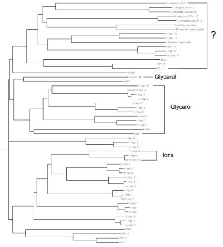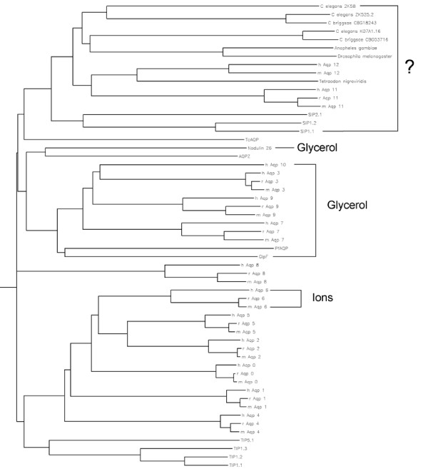 Figure 2. Major Intrinsic Protein Superfamily. Phylip rooted phylogenetic tree of aquaporin proteins from diverse species. Shown are aquaporins from mouse (m), rat (r), and human (h); from plants Arabidopsis thaliana (SIPs, TIPs) and soybean Glycine max (Nodulin 26); from bacteria E. coli GlpF and AqpZ; from intracellular parasites Trypanosoma cruzi (TcAQP) and Plasmodium falciparum (PfAQP); from nematodes C. elegans and C. briggsae; from fruitfly D. melanogaster and mosquito A. gambiae; from pufferfish T. nigroviridis. Aquaporins that transport glycerol or ions, in addition to water, are labeled by brackets on the right. Aquaporins hat transport only water are unlabelled. Aquaporins for which there is no known solute are labeled with a question mark. In many cases only one or two of the mammalian aquaporins in a specific group have been characterized. For example, TIP1.1 is a water-selective channel, but TIP5.1 has not been characterized; human and rat AQP6 are ion and water channels, but mouse AQP6 has not been characterized.