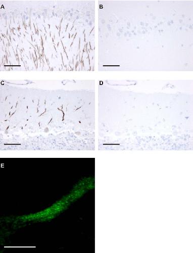 Figure 7. Localization of AQP11 in rat cerebellum and hippocampus. Semi-thin sections of rat brain were stained with an anti-N-terminal AQP11 antibody. (A) The CA1 and CA2 regions of the hippocampus displayed a filamentous labeling pattern. (B) Preabsorbing the antibody with the immunizing peptide prevented labeling in an adjacent section. (C) The dendrites of Purkinje cells showed strong AQP11 immunoreacivity which was absent after peptide preabsorption (D). Bars indicate 50 μm. (E) Immunofluorescence confocal micrograph showing punctuate labeling inside a Purkinje dendrite. Bars indicate 10 μm.