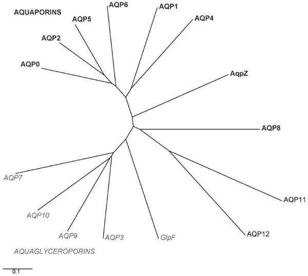 Figure 1. Phylogenetic tree of the human Aquaporin gene family. Water permeable aquaporins are shown in bold (AQP0, 1, 2, 4, 5, 6, 8, AqpZ). Glycerol permeable aquaglyceroporins are in italics (AQP3, 7, 9, 10, GlpF). E. coli homologues are AqpZ and GlpF. The unclassified subfamily comprising AQP11 and 12 is on the bottom right. The scale bar represents genetic distance between homologues.