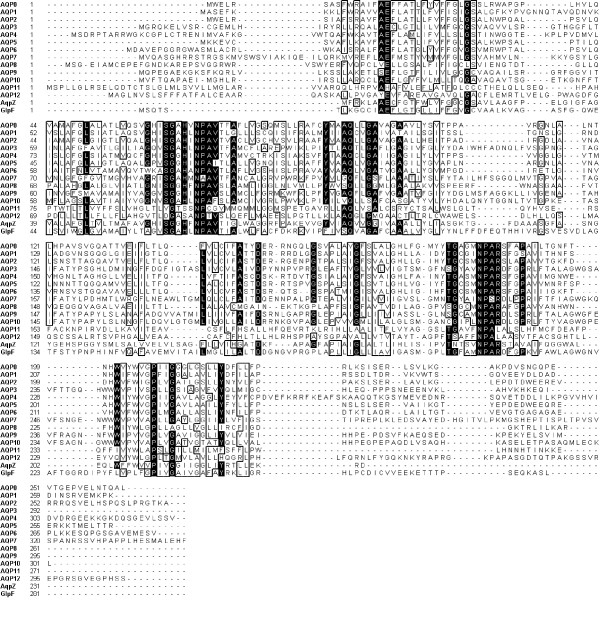 Figure 3. Sequence alignment of human Aquaporins. Clustal alignment of human aquaporins and E. coli AqpZ and GlpF proteins. Identical residues are highlighted in black, residues with at least 70% similarity are boxed.