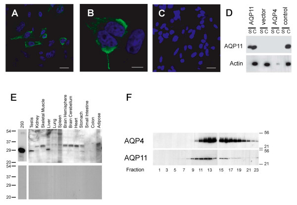 Figure 5. Validation of anti-AQP11 antibody and tissue immunoblotting. (A) – (C) Confocal images of cultured CHO cells transiently transfected with rat AQP11 (A, B) or with empty vector (C) and stained with anti-AQP11 C-term antibody. Bars represent 20 μm (A, C) and 5 μm (B). (D) CHO cells were transiently transfected with rat AQP11, empty vector, or rat AQP4 M23 and treated with membrane impermeable biotin, then precipitated with streptavidin. Surface proteins eluted from the streptavidin (S) and cytosolic proteins from the supernatant (C) were analyzed by SDS-PAGE followed by immunoblotting with antibodies against AQP11 and actin. As a control, cells transfected with AQP11 were precipitated with streptavidin but not incubated with biotin. (E) Western blot of multiple rat tissue probed with AQP11 antibody (upper panel). The bottom panel was probed with the same antibody preincubated with antigenic peptide. (F) Sucrose density sedimentation of AQP11 from rat brain. Membrane proteins from rat brain hemispheres were layered onto a 5–20% linear sucrose gradient, spun, and analyzed by SDS-PAGE followed by immunoblotting for either AQP4 or AQP11. Fraction 1 corresponds to the lightest fraction, 23 to the heaviest. Molecular size in kDa is shown.
