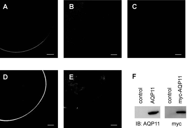 Figure 6. Expression of AQP11 in Xenopus oocytes. Oocytes were injected with rat AQP11 cRNA (A, B), myc-tagged human AQP11 (D), or water (C, E) and stained with an antibody against rat AQP11 (A, C), with the antibody preadsorbed to antigenic peptide (B), or with an antibody against myc (D, E). Scale bars represent 100 μm. (F) Immunoblots of total protein from oocytes injected with rat AQP11 (AQP11), myc-tagged human AQP11 (myc-AQP11) or water (control). Blots were probed with anti-AQP11 antibody or with anti-myc antibody, respectively.