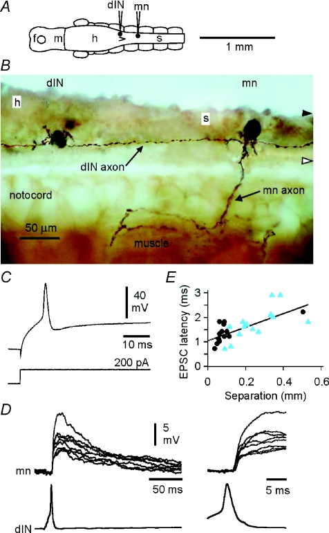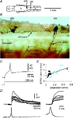 Figure 2. Excitatory connections from dINsA, diagram of the CNS in dorsal view to show a recorded dIN and motoneuron (mn) (shown in B–D). B, photomicrograph of neurobiotin-filled neurons in lateral view where a rostral dIN with short dendrites has a descending axon that passes a more caudal motoneuron (mn) with mainly ventral dendrites and identified by its peripheral axon. C, the dIN in B shows a characteristic single, broad action potential in response to injected depolarising current. D, paired recording from the neurons in B (at two time scales; Mg2+ omitted from saline) shows that current-evoked spikes in the dIN produce long EPSPs in the motoneuron (left) at consistent, short latencies (right). E, latencies of EPSPs increase with separation between presynaptic dINs and their postsynaptic targets (dIN–dIN synapses, circles; dIN–non-dIN synapses, triangles). The regression equation is d = 1.04 + 2.79s where d is delay in ms and s is separation in mm.