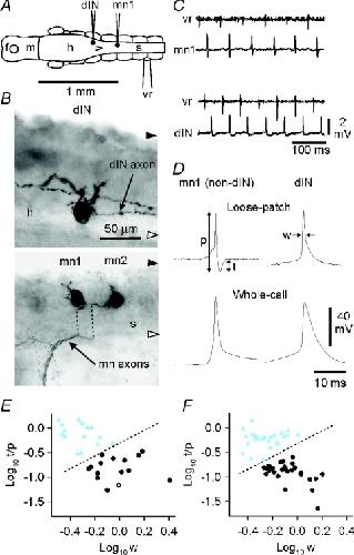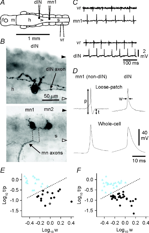 Figure 5. Distinguishing neurons by spike shape in loose patch recordingsA, locations of illustrated neurons (from separate recordings; contralateral ventral root electrode). B, anatomical characterisation of a dIN (upper micrograph) with 2 large dorsal dendrites and a single descending axon (an additional axon is from a separate neuron) and one of a pair of motoneurons (lower micrograph; mn1; dotted lines indicate displacement of axons during processing). Black and white arrowheads indicate the dorsal and ventral limit of the CNS respectively (h: hindbrain, s: spinal cord). C, loose patch recordings of activity from a non-dIN neuron (mn1) and a dIN during swimming, monitored from a ventral root on the opposite side. D, distinguishing dINs from non-dINs by extracellular spike shape (upper records, normalised to the amplitude of the initial peak; p: peak-to-peak amplitude, t: trough amplitude, w: width at half initial peak amplitude). Lower records are corresponding spikes during swimming after attaining the whole-cell configuration (all averages of ∼20 spikes). E, cluster analysis distinguishes two groups of neurons that match a separation based on anatomical features (circles, dIN; triangles, non-dIN; open symbols are the illustrated neurons). F, cluster analysis on a larger group of neurons (n= 52) selected at random from those used to measure spike timing during swimming (see Fig. 6) again separates the neurons into two groups, equivalent to the dINs and non-dINs in E.