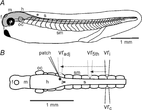 Figure 1. The hatchling Xenopus tadpole and adjustments to timing measurements according to recording sitesA, diagram of the tadpole in side view to show the CNS (grey) and its regions (f, m, h: fore-, mid- and hind-brain; s: spinal cord; oc: otic capsule;*: obex) with swimming muscles (sm) in chevron shaped segments. White dot indicates the neuron in B. B, diagram of the CNS and swimming muscles in dorsal view to show typical sites for electrodes to record from a single neuron (patch) and ventral roots on the ipsilateral (vri) or contralateral (vrc) side. Measured timings of neuron activity were adjusted as though relative to recordings from either an assumed, adjacent ventral root (vradj) or the 5th post-otic ventral root (vr5th) on the same side as the recorded neuron (arrows and grey electrodes; see text for details).