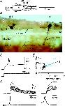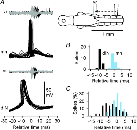 Figure 4. Spikes in dINs are early relative to those in non-dINs and vrs during swimmingA, overlapped spikes of a motoneuron (mn) and dIN aligned relative to the start of ‘adjacent’ ventral root (vr) bursts (dashed line) show that the dIN fires earlier. The inset diagram shows the typical recording arrangement (actual recording site and vr bursts, black; adjusted recording site and vr bursts, grey; see Fig. 1). B, distribution of spike peak timing for the two neurons in A. C, the relative timing of spike peaks for 16 dINs (dark bars) and 15 non-dINs (light bars), all adjusted to give timings relative to an adjacent ventral root. Distributions of spike timings for each neuron (e.g. B) were normalised (as % of the whole sample of spike times for each neuron, using 2 ms bins) and then combined to give overall spike time distributions for dINs and non-dINs.
