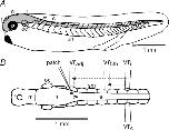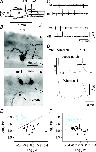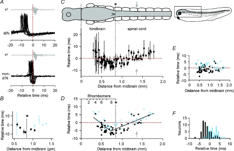 Figure 6. Timing of neuron spikes during swimmingA, timing of spikes in a dIN (upper) and non-dIN (lower) recorded in the same animals with loose patch, aligned relative to the start of vr bursts adjusted to the 5th post-otic cleft. The vertical dashed line indicates vr burst onset. B, the timing of spikes (±s.d.) in dIN (circles) and non-dIN (triangles) neurons recorded at different longitudinal positions in a single animal. C, the timing of spikes (±s.d.) at different longitudinal positions for the whole data set (103 neurons). The dorsal view of the CNS and swimming muscles (labelled in Fig. 1B) is shown at the same scale and horizontal alignment as the graph; the small lateral view of the tadpole shows the region illustrated (*: obex; grey arrow: 5th post-otic cleft used as a timing reference; horizontal dashed line: 0 ms). D, the timing of spikes as in C showing neuron identification (dIN, circles; non-dIN, triangles) and contiguous regression lines (0â0.725 mm: y= 9.575 â 20.605x, where y is in ms and x is in mm, R2= 0.51; from 0.725 mm: y=â13.013 + 10.659x; R2= 0.63). Approximate rhombomere boundaries and obex (*) are indicated. E, deviation of timing measurements from the regression lines in D (slope: 0.05 ms mmâ1, R2= 0.00). F, mean firing times of dINs (dark bars) and non-dINs (light bars), transformed to remove the effect of longitudinal position as in part E.