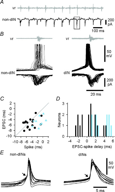 Figure 7. The relative timing of spikes and EPSCs during swimmingA, recording from a non-dIN neuron under voltage clamp during swimming showing EPSCs for timing measurement (e.g. box). Swimming was monitored from a ventral root on the opposite side (vr: shown adjusted as though recorded from the same side). B, superimposed, spikes and vr bursts from consecutive swimming cycles in a non-dIN and a dIN. Below each are overlapped EPSCs from separate swimming sequences in the same neurons, also aligned to the starts of vr bursts (adjusted as in A). C, the timing of spikes and EPSCs (median values from individual neurons) measured relative to vr burst onset (dIN, circles; non-dIN, triangles; line indicates equality). D, the delay between EPSCs and spikes in the same neuron, plotted for individual dINs (dark bars) and non-dINs (light bars). E, overlapped averages of spikes recorded from different neurons during swimming to show pre-potentials (= EPSPs) in non-dINs and immediate take-offs in dINs (arrows).