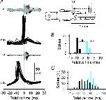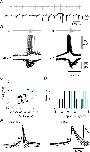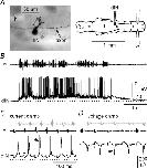 Figure 8. Post-inhibitory rebound in dINsA, rebound spikes to current pulses (dIN1), then a rebound spike following a spontaneous IPSP (at arrow), producing an EPSC (*) in a postsynaptic neuron (dIN2). B, when held just above spike threshold, a dIN fires on rebound following an IPSP (at arrow) elicited by the second of two spikes evoked in an inhibitory interneuron (Inh IN) by depolarising current (bars). Evoked and rebound spikes in the dIN both evoke EPSPs (*) in the inhibitory interneuron. Right, averages of 5 rebound spikes in the dIN and resulting EPSPs in the inhibitory interneuron. C, rebound in a dIN, depolarised just above spike threshold, following IPSPs (arrow) evoked by stimulation (at arrowhead) of the contralateral side of the spinal cord (upper overlapped traces). No rebound occurs where IPSPs fail (middle traces) or when the dIN is at rest (lower traces).