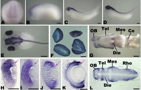 Fig. 1. Expression pattern of miR-124a during the development of Xenopus laevis. (AâG) Expression of miR-124a (dark blue) as detected by whole mount in situ hybridization in Xenopus embryos at stage 18 (A), stage 23 (B), stage 33 (C), stage 37 (D), stage 46 (E), and dissected adult retinas (F) and brain (G), shown from the anterior (A), lateral (BâD), or dorsal views (E and G). (HâL) Restricted location of miR-124a in the eye (HâK) and brain (L) is shown on transversal (HâK) or coronal sections (L) at stage 33 (H), stage 37 (I), stage 40 (J), and stage 46 (K and L). The pink arrow indicates the most peripheral part of the dorsal ciliary marginal zone. Scale bars: 300 μm (AâE); 1 mm (F and G); 100 μm (HâL). Ce, cerebellum; Die, diencephalon; Mes, mesencephalon; OB, olfactory bulb; Rho, rhobemcephalon; Tel, telencephalon.