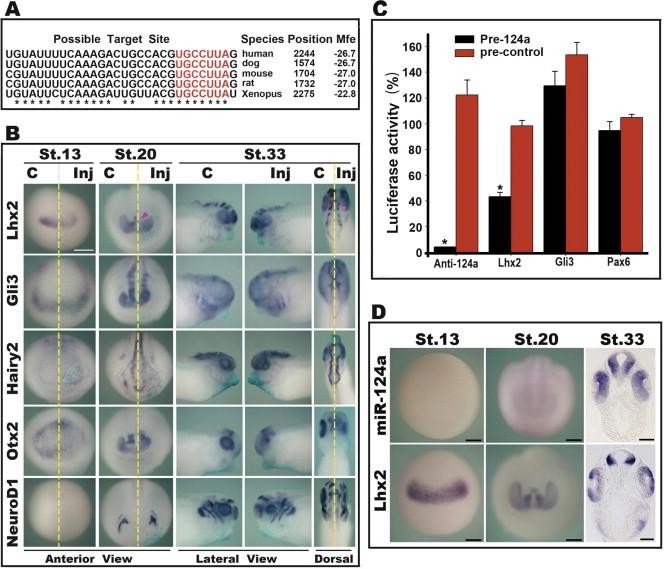Fig. 4. miR-124a and its candidate targets. (A) An evolutionarily conserved miR-124 target site is found at the 3ⲠUTR of Lhx2 mRNAs in different species. Seed sequences are marked in red. Homologous sites are marked by asterisks. (B) Expression of the predicted targets of miR-124a: Lhx2, Hairy2, Gli3, NeuroD1 and Otx2 were detected by whole mount in situ hybridization. Embryos were injected with 0.05 pmol miR-124a precursor molecules into one dorsal-animal blastomere at the 8-cell stage and collected at stage 13 (anterior view), stage 20 (anterior view) or stage 33 (lateral view and dorsal view). The pink arrowhead indicates the reduced expression of Lhx2 on the injected side. Scale bars: 500 μm. (C) Luciferase assays were carried out in HEK293 cells using the pCS2-Luc-3ⲠUTR reporters of Lhx2, Gli3, and the positive (anti-miR-124a) and negative (Pax6) controls. Luciferase activity after transfection of the miR-124a precursor (pre-124a) or control precursor (pre-control) was normalized by that of the control cells without precursor transfection. Data are expressed as the means of three independent transfections ±SD, each carried out in triplicate. Asterisks indicate where the miR-124a transfected group was significantly different from the control precursor group (P < 0.05). (D) In situ hybridization detection of miR-124a and Lhx2 expression in Xenopus embryos at stage13 (anterior view), stage 20 (anterior view) and stage 33 (transection at the eye-level). Scale bars: 300 μm (stage 13, stage 20); 100 μm (stage 33).