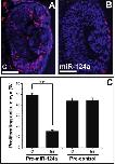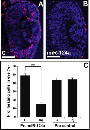 Fig. 5. miR-124a overexpression inhibits cell proliferation during retinogenesis. miR-124a or control miRNA precursor (0.025 pmol) was co-injected with GFP mRNA into one dorsal-animal blastomere of a Xenopus embryo at the 8-cell stage, and cell proliferation was detected by BrdU incorporation. (A and B) Transversal section of a stage 33 embryo at the level of the eye showing that the number of proliferating cells (BrdU-positive, red) on the miR-124a overexpressed side (miR-124a) was much lower than that on the control side (C). All cell nuclei were counterstained with Hoechst 33258 (blue). Scale bar: 100 μm. (C) The ratio of proliferating retinal cells (BrdU-positive/Hoechst-labeled cells) in either the injected side (inj) or the control side (C) of embryos injected with miR-124a (pre-miR-124a) or control (pre-control) precursors. Data are expressed as means ± SE from twelve sections of four embryos. A significant difference (**P < 0.01 by one-way ANOVA followed by Duncanâs test) between the mean ratios between the injected and control sides was only detected for pre-miR-124a injected embryos.