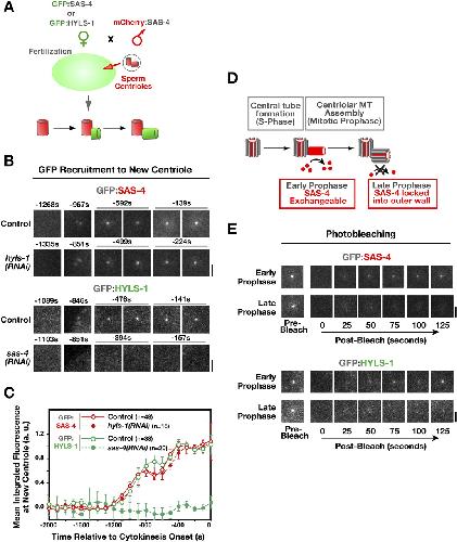 Figure 2. HYLS-1 is stably incorporated into newly forming centrioles in an SAS-4-dependent manner. (A) Schematic of the method used to analyze recruitment of centriolar proteins to site of centriole assembly (Dammermann et al. 2008). Briefly, sperm centrioles labeled with mCherry:SAS-4 were introduced by mating into oocytes expressing a GFP fusion with HYLS-1 or SAS-4. Recruitment of the GFP-labeled protein to newly forming centrioles was quantified by measuring the GFP fluorescence coincident with the mCherry signal at each time point. Measurements from multiple embryos were pooled and averaged to generate each recruitment plot. (B,C) Representative images (B) and quantification (C) of centriolar GFP:SAS-4 or GFP:HYLS-1 recruitment in control embryos and embryos depleted of HYLS-1 or SAS-4 as indicated. HYLS-1 recruitment requires SAS-4 but not vice versa. Times are in seconds relative to cytokinesis onset. Error bars are the 90% confidence interval. (D) SAS-4 is recruited to centrioles during the formation of the central tube in S phase, but remains in dynamic exchange with the cytoplasmic pool of SAS-4 until assembly of the centriolar microtubules in late prophase locks it into the outer centriole wall (Dammermann et al. 2008). (E) GFP:SAS-4 and GFP:HYLS-1 exhibit an identical behavior in a photobleaching-based assay assessing the ability of the centriolar protein to exchange with cytoplasmic pools. Recovery is observed if centrioles are bleached in early prophase (GFP:SAS-4, n = 8 out of 8; GFP:HYLS-1, n = 8 out of 8), but not if centrioles are bleached in late prophase (GFP:SAS-4, n = 1 out of 22; GFP:HYLS-1, n = 0 out of 9). Bars, 2 μm.