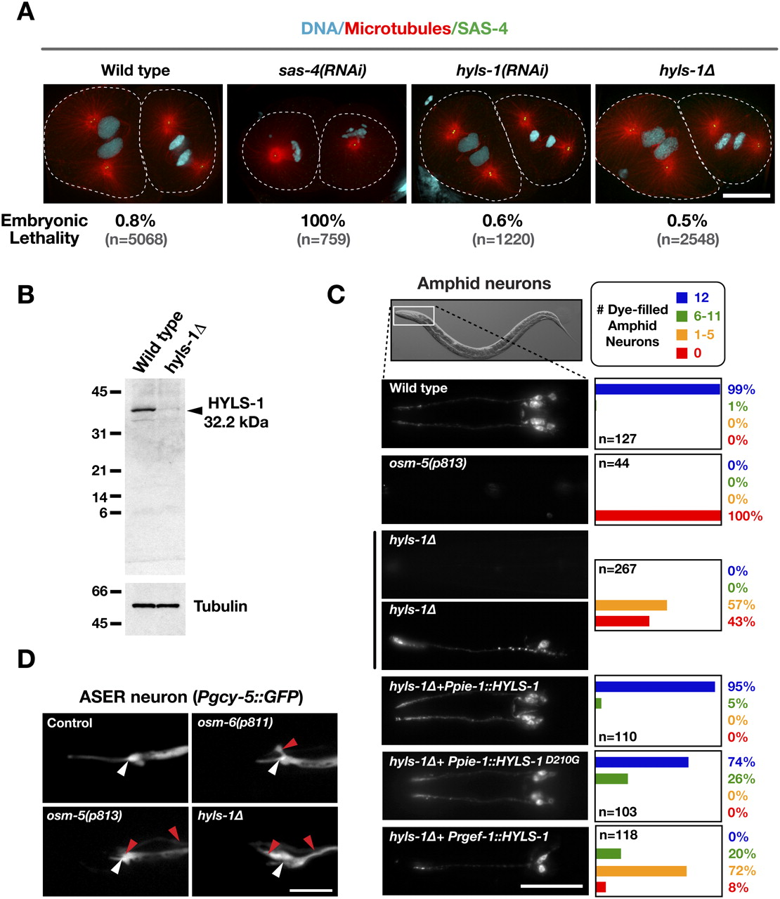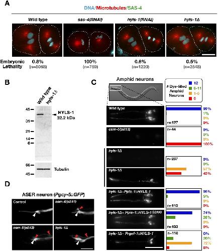 Figure 3. HYLS-1 is dispensable for centriole assembly and centrosome function, but is essential for ciliogenesis. (A) Embryos in second mitotic division stained for DNA, α-tubulin and SAS-4. The percentage embryonic lethality for each condition is indicated. (B) Immunoblot comparing wild-type and hyls-1δ whole-worm extracts probed with an antibody raised against full-length HYLS-1. Arrowhead indicates wild-type HYLS-1, which runs slightly higher than its predicted molecular weight. A size of 16.7 kDa would be expected for mutant HYLS-1 based on initiation at the first (in-frame) ATG following the deleted region. (C) Representative images and quantification of DiI uptake in amphid neurons of wild-type and mutant animals. hyls-1δ animals display a dye-fill defectâindicative of a failure of cilia assemblyâthat is fully rescued by wild-type HYLS1 and partially by HYLS-1D210G when expressed from a germline promoter (Ppie-1). Expression of HYLS-1 from a pan-neuronal promoter (Prgef-1) fails to restore ciliogenesis. (D) Cytoplasmic GFP expressed in the ASER amphid neuron using a cell-specific promoter (Yu et al. 1997). The position of the transition zone is marked (white arrowhead). GFP fills the dendrite (right of white arrowhead) and cilium (left of white arrowhead) of wild-type animals. The ASER neuron lacks ciliary projections in osm-5(p813) and osm-6(p811) IFT mutants as well as in the hyls-1δ mutant. Red arrowheads indicate aberrant protrusions in cilia-defective mutants. Bars: A,D, 10 μm; C, 50 μm.