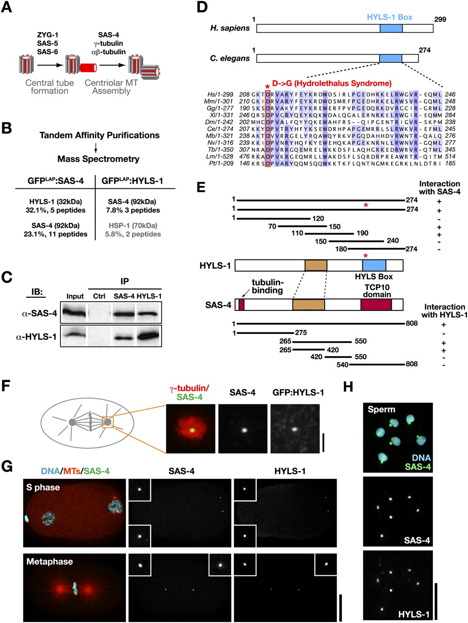 Figure 1. HYLS-1 directly associates and colocalizes with the core centriolar structural protein SAS-4. (A) Schematic of centriole assembly pathway in C. elegans: The central tube, a cylindrical intermediate that templates centriole dimensions, assembles in S phase via an SAS-4-independent process. SAS-4 is recruited to the central tube and directs the assembly of the stabilized microtubules that constitute the outer centriole wall during mitotic prophase (Pelletier et al. 2006; Dammermann et al. 2008). (B) Results of mass spectrometry performed on tandem affinity preparations of SAS-4 and HYLS, listing all polypeptides above 5% coverage. (C) Immunoblot showing SAS-4 and HYLS-1 coimmunoprecipitate from embryo extracts. (D) Schematics of human and C. elegans HYLS-1, indicating position of conserved âHYLS-1 box.â Alignment shows HYLS-1 orthologs from vertebrates, Drosophila, C. elegans, and ciliates highlighting invariant aspartic acid mutated in hydrolethalus syndrome. (E) SAS-4 and HYLS-1 directly interact in a yeast two-hybrid assay via their middle portions (brown). For reference, the location of the conserved HYLS-1 box (blue), and the N-terminal tubulin-binding and C-terminal TCP10 motifs in SAS-4 (red), are also shown. The hydrolethalus-associated mutation does not affect interaction with SAS-4. (F) Centrosome from a metaphase embryo stained with antibodies to γ-tubulin as a marker for the pericentriolar material, SAS-4 and GFP. GFP:HYLS-1 colocalizes with SAS-4 at centrioles, which appear as a small focus in the center of the pericentriolar material. (G,H) HYLS-1 colocalizes with SAS-4 to centrioles throughout the embryonic cell cycle (G) and in sperm (H). Bars: F, 1 μm; G, 10 μm; H, 5 μm. Insets in G are magnified 3Ã.