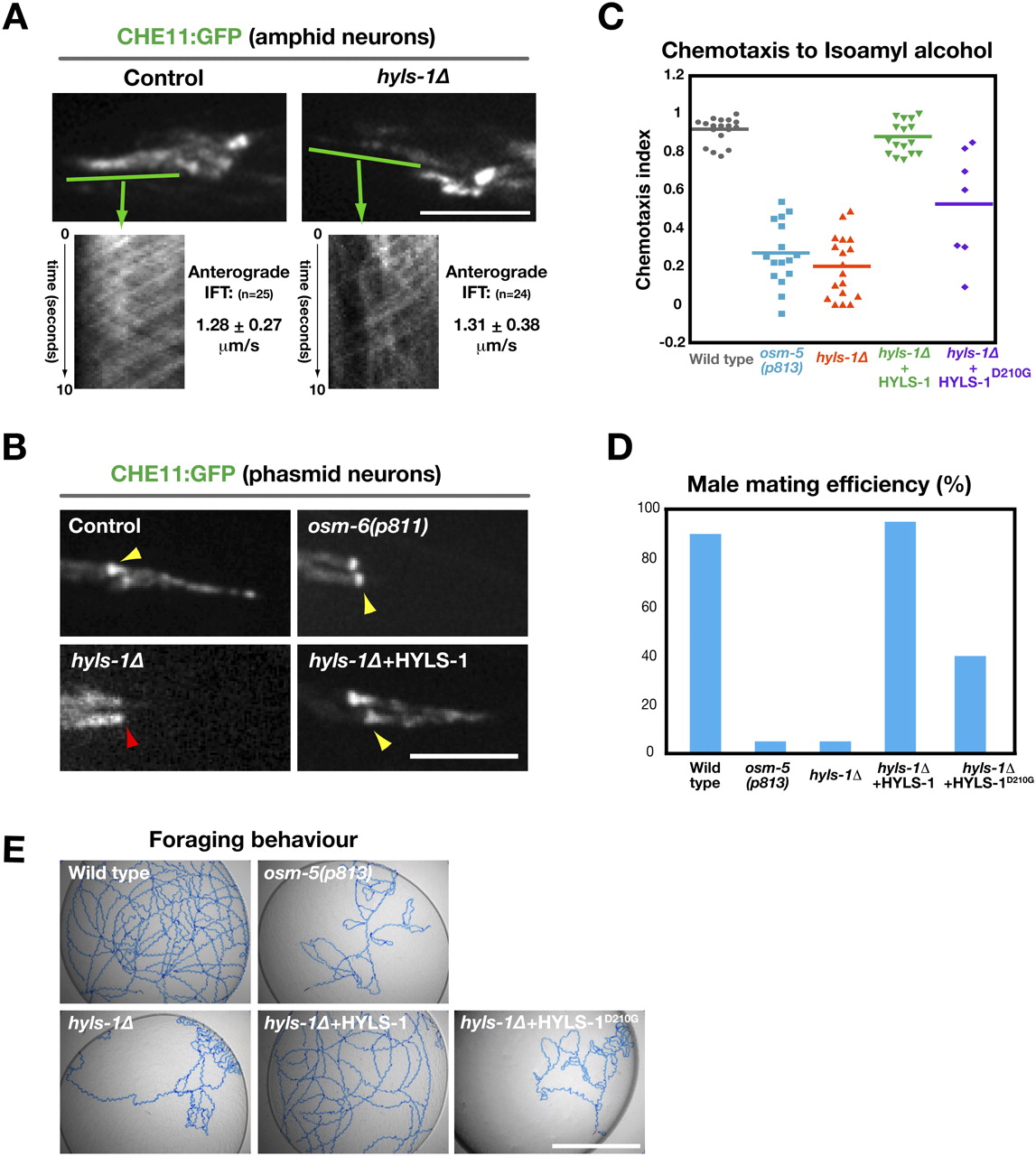 Figure 5. HYLS-1 acts in an IFT-independent early step in ciliogenesis. (A) IFT is unchanged in residual cilia of hyls-1δ animals. Stills from time-lapse sequences of amphid neurons expressing CHE-11:GFP (Supplemental Movies S1, S2) and kymographs showing IFT particle movement along ciliary axonemes. IFT rates were determined for particles in the distal segment. Note that there are eight ciliated neurons in each amphid bundle in wild-type, but only a single cilium in the hyls-1δ mutant, explaining the difference in the number of particles. (B) CHE-11:GFP fails to accumulate at the transition zone of hyls-1δ animals. Stills from time-lapse sequences of phasmid neurons expressing CHE-11:GFP. Arrowheads indicate position of transition zone. (C) Results of chemotaxis assays performed with wild-type and mutant animals. Each data point represents one assay with >100 animals. (D) Male mating efficiency of wild-type and mutant animals. The ability of individual L4 males to produce cross-progeny with unc-119 mutant hermaphrodites was scored (percentage of males producing crossprogeny; n = 20 per genotype). (E) Foraging behavior of wild-type and mutant animals. Tracks generated by a single animal left for 16 h on an NGM plate seeded with OP50 bacteria are shown. While wild-type animals efficiently explore their environment, cilia-defective mutant animals fail to do so, exhibiting a dwelling phenotype (Fujiwara et al. 2002). Bars: A,B, 5 μm; E, 1 cm.