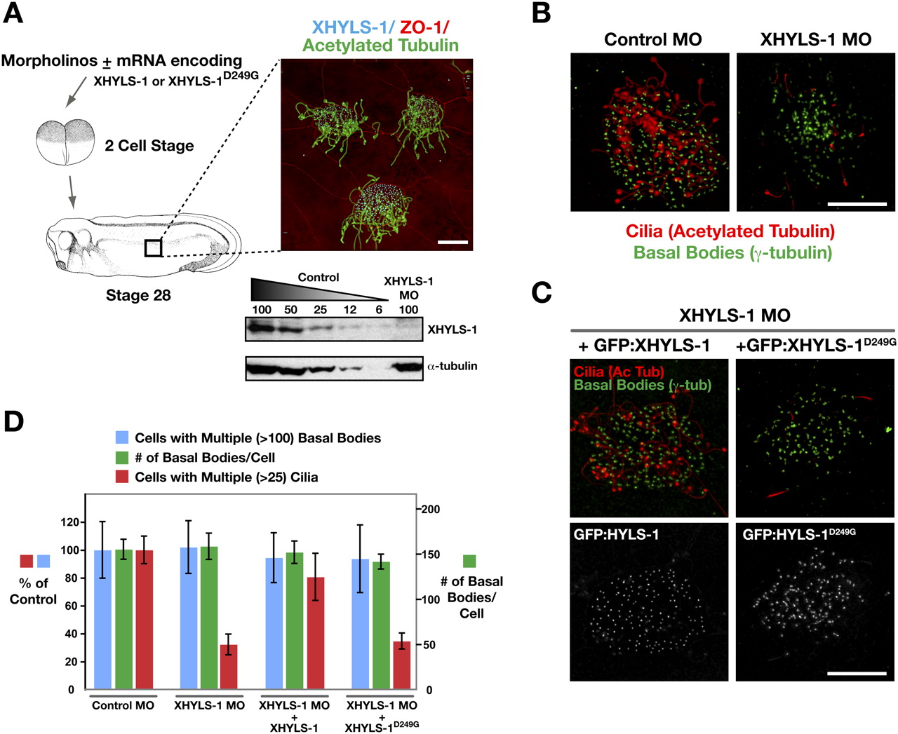Figure 6. The role of HYLS-1 in ciliogenesis is conserved in vertebrates. (A) Schematic of Xenopus experiments. Inset shows ciliated epithelial cells stained for XHYLS-1, cilia (acetylated tubulin), and apical cell junctions (ZO-1). Immunoblot of control and XHYLS-1 morpholino (MO) tailbud-stage embryo extracts. (B) Basal bodies (γ-tubulin; green) are present, but cilia (acetylated tubulin; red) fail to assemble in XHYLS-1-depleted embryos. (C) Expression of wild-type but not disease mutant (D249G) XHYLS-1 fused to GFP restores ciliogenesis in XHYLS-1-depleted embryos. (D) Quantification of morpholino experiments. n = 10â12 embryos, 30 fields of view per embryo (cells with multiple cilia/basal bodies); 20 cells (basal bodies per cell). Bars, 10 μm. Error bars in D are the 95% confidence interval.