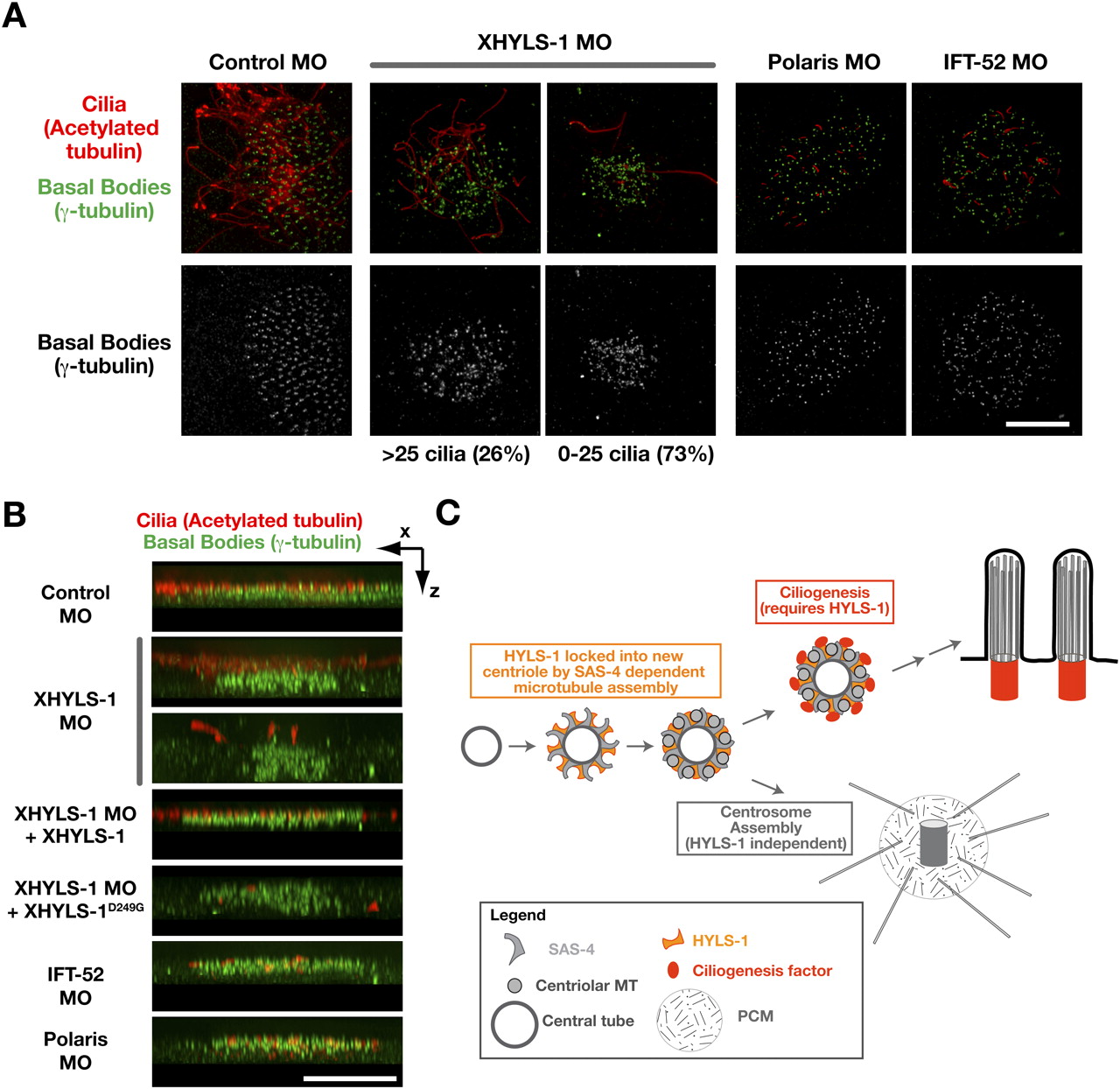 Figure 7. XHYLS-1 is required for apical targeting/anchoring of basal bodies. (A) Representative images of control embryos and embryos depleted of XHYLS-1, Polaris or IFT-52, stained with antibodies to acetylated tubulin and γ-tubulin to illustrate effect on basal body distribution. Images are xây projections of deconvolved 3D data stacks. (B) xâz projection of 3D data stacks presented in A and Figure 6C. (C) Model for the role of HYLS-1 in cilia formation. HYLS-1 is recruited to the forming centriole by its association with SAS-4, and like SAS-4 is locked into the centriole during the assembly of centriolar microtubules. Incorporation of HYLS-1 confers on centrioles the capacity to initiate ciliogenesis. Bars, 10 μm.