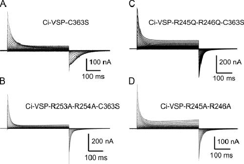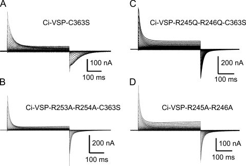 Figure 2. Sensing currents from oocytes expressing different mutants of Ci-VSP. Sensing currents were recorded by applying voltage pulses of 400 ms, ranging from −100 to 140 mV. The HP was −60 mV. (A) Sensing currents for the phosphatase-inactivated mutant Ci-VSP C363S. When pulsing to positive potentials from the HP, all the mutants, R253A-R254A-C363S (B), R245Q-R246Q-C363S (C), and R245A-R246A (D), displayed sensing currents similar to those observed with the mutant C363S. In contrast, during the repolarization to the HP, all the PBM mutants displayed faster OFF sensing currents.