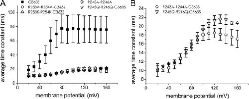 Figure 3. Average time constant of the OFF sensing current of different mutants of Ci-VSP. (A) The OFF sensing current recorded from the PBM mutants (open symbols) R253A-R254A-C363S (n = 5), R253K-R254K-C363S (n = 4), R245Q-R246Q-C363S (n = 4), and R245A-R246A (n = 4) were significantly faster than those recorded from the C363S mutant (filled squares; n = 5) for all potentials tested above +20 mV (HP = −60 mV). (B) The mutant R245Q-R246Q C363S displayed slower OFF sensing current than those from the mutant R253A-R254A-C363S for pulses above +100 mV.