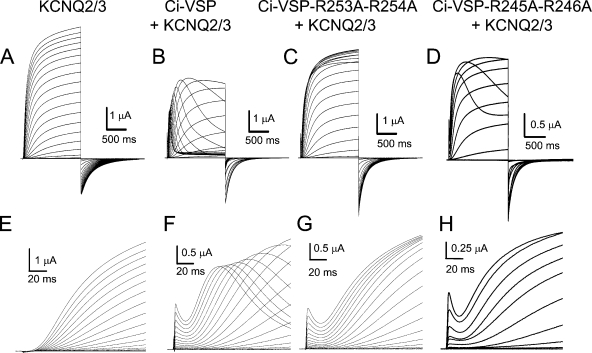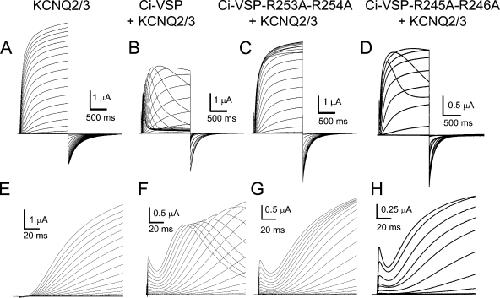 Figure 4. Phosphatase activity of Ci-VSP monitored by the activity of the potassium-selective, voltage-, and PI(4,5)P2-dependent channels KCNQ2 and KCNQ3. (A) Currents of KCNQ2/3 expressed without Ci-VSP. (B) When KCNQ2/3 were expressed with the WT form of Ci-VSP, a strong decrease in the activity was observed at potentials above +20 mV. (C) Coexpression with the mutant R253A-R254A caused a slight decrease in the current of KCNQ2/3, only observable at very positive potentials. (D) Likewise, coexpression with the mutant R245A-R246A caused an initial decrease in the current of the channels at potentials above +80 mV. However, the effect on the ionic current was less profound than that observed with the mutant R253A-R254A. (E) Transient initial currents were not observed when mRNA coding for Ci-VSP was not injected in the oocytes along with the mRNA for KCNQ2/3. (F–H) In contrast, transient initial currents were observed in the presence of the phosphatase. These currents are the sensing currents of Ci-VSP. Pulses range from −100 to +100 mV. HP = −90 mV. For A–C and E–G, the interval between pulses was 10 mV. For D and H, it was 20 mV.