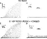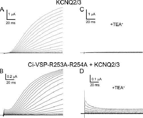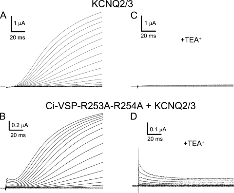 Figure 5. Block of ionic current from oocytes expressing KCNQ2/KCNQ3 alone (A and C) and coexpressed with Ci-VSP R253A-R254A (B and D). (A) The K+ currents of KCNQ2/3 when depolarizing the oocytes. (B) Coexpression of the mutant R253A-R254A and KCNQ2/3 yielded K+ currents and, in addition, sensing currents from Ci-VSP. (C) Oocyte expressing KCQ2/3 alone shows no currents after replacing K+ for TEA+ in the internal and external solutions during cut-open recording. (D) In contrast, when KCNQ2/3 was coexpressed with the R253A-R254A mutant of Ci-VSP, TEA treatment showed the transient current characteristic of the sensing currents of Ci-VSP. Pulses range from −100 to +100 mV. HP = −90 mV.