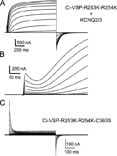 Figure 6. (A) The ionic current through KCNQ2/3 was not decreased after depolarization when coexpressed with the mutant R253K-R254K. (B) Ci-VSP is shown to be expressed because its sensing currents can be observed immediately after depolarization. (C) The phosphatase-inactivated mutant R253K-R254K-C363S was expressed alone to study sensing currents. The R253K-R254K-C363S mutant exhibits ON sensing currents that look very similar to those observed from the C363S mutant, although the OFF currents did not display the typical change in mode, observed with the C363S mutant (see Fig. 3). Pulses range from −100 to +100 mV. HP = −90 mV for ionic currents and −60 mV for sensing currents.