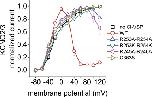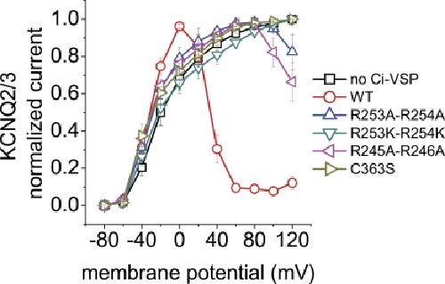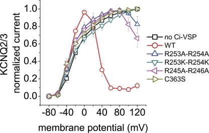 Figure 7. The activity of the Ci-VSP expressed as the average of the amplitude of the KCNQ2/3 current after 1.5 s of depolarization normalized to the maximum current. When compared with the C363S mutant, the only values significantly different are those from the R253A-R254A-C363S mutant and the R245A-R246A mutant for potentials above +100 and +80 mV, respectively.