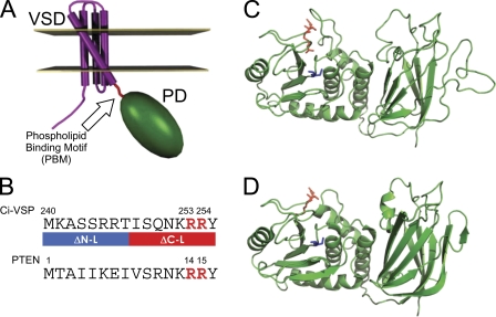 Figure 1. (A) Cartoon representation of the structure of Ci-VSP. The N terminus of Ci-VSP spans four transmembrane segments forming the VSD, and the fourth segment (S4 segment) of the VSD is connected to the PD by the PBM. (B) The proposed PBM of Ci-VSP shares 50% identity with the first 16 amino acids of the PTEN. (C) Homology model of the PD of Ci-VSP. This homology model was created by the online package 3D-jigsaw using residues 240–576 of Ci-VSP (http:// bmm.cancerresearchuk.org/∼3djigsaw/). The obtained model comprises residues 253–574. (D) Crystal structure of PTEN. The crystal structure of PTEN is constituted by residues 14–351 (Lee et al., 1999). Arginines 253 and 254 of Ci-VSP (C) and 14 and 15 of PTEN (D) are displayed in red. These residues are implicated in the formation of the putative PBM in these proteins. Cysteine 363 of Ci-VSP and 124 in PTEN are displayed in blue. These residues are essential for the activity of the catalytic site.