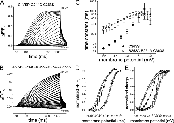 Figure 8. The mutants G214C-C363S and G214C-R253A-R254A-C363S were expressed in oocytes and labeled with TMRM. Changes in the fluorescence emission of TMRM observed from the mutant G214C-R253A-R254A-C363S (B) were slower than those observed from the mutant G214C-C363S (A) when a conditioning pulse to +80 mV was applied for 5 s to produce the relaxation of the VSD. The differences in the time constant of the fluorescence were significant for all the potentials tested below −10 mV (C), reaching up to fourfold below −100 mV. The voltage dependence of the normalized amplitude of the fluorescence change showed no difference between G214C-C363S (D; filled squares) and G214C-R253A-R254A-C363S (D; open squares) when the HP = −60 mV. However, the amplitude of the fluorescence change from the G214C-R253A-R254A-C363S mutant showed a clear shift toward negative potentials (D; open circles) with respect to the G214C-C363S mutant (D; filled circles) when the membrane was conditioned to +80 mV for 5 s. Likewise, the voltage dependence of the charge movement displays a small shift toward positive potentials for the mutant G214C-R253A-R254A-C363S (E; open squares) with respect to the mutant G214C-C363S (E; filled squares). Prepulsing the membrane to +80 mV for 5 s produces a deeper relaxation of the VSD of the mutant G214C-R253A-R254A-C363S, as reflected by a larger shift toward negative potentials (E; open circles) with respect to the shift observed in the mutant G214C-C363S (E; filled circles).