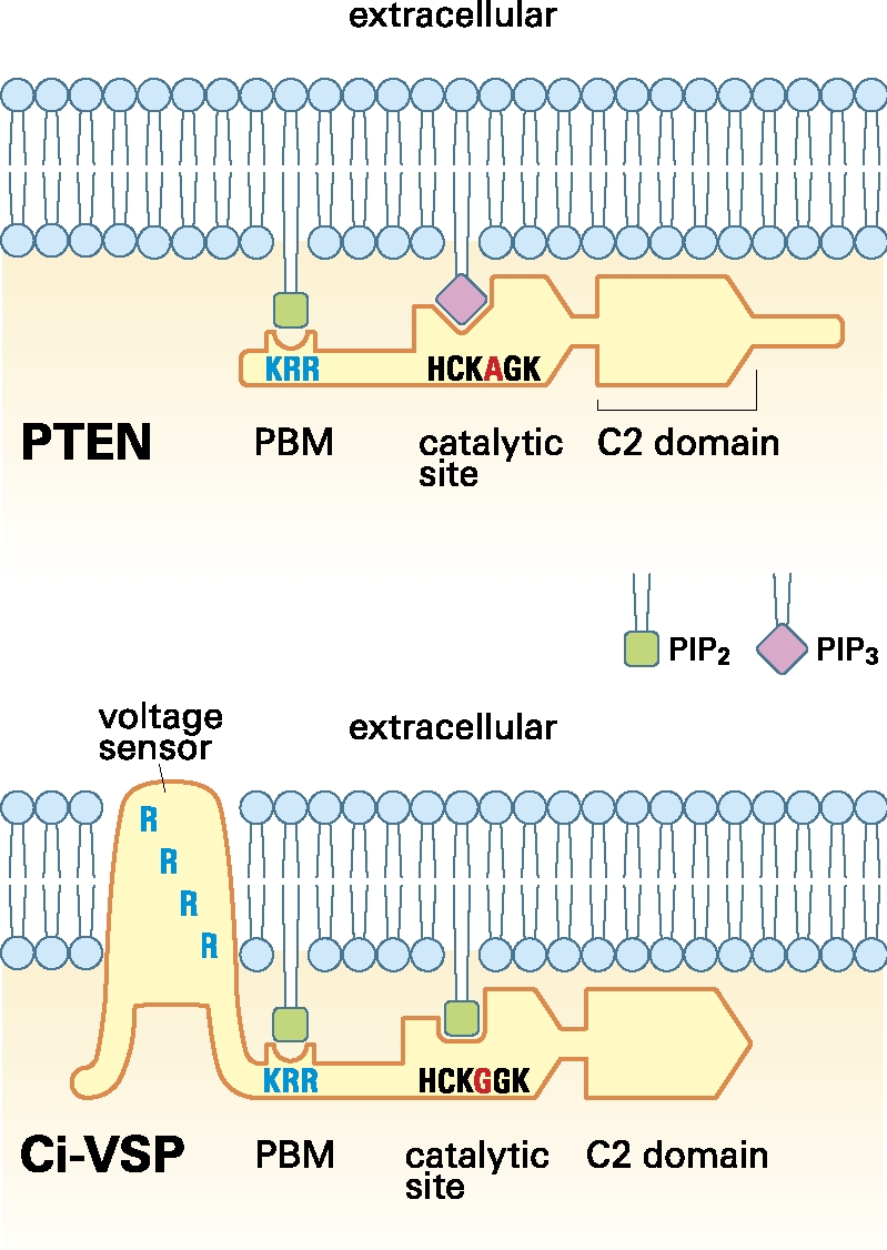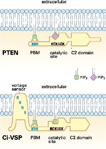 A voltage-sensing phosphatase, Ci-VSP, which shares sequence identity with PTEN, dephosphorylates phosphatidylinositol 4,5-bisphosphate.