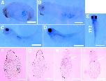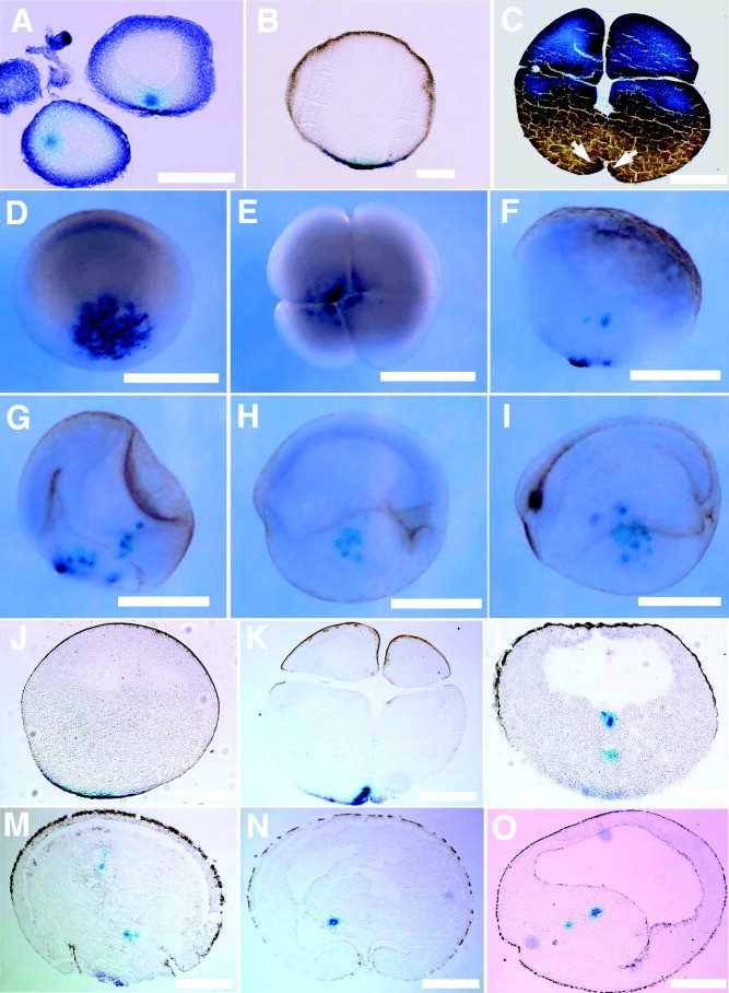 Figure 3. Spatial expression patterns of Xenopus tropicalis DAZ-like gene (Xtdazl) mRNA until neurula stage by whole-mount in situ hybridization. A,B: Section of Xtdazl-stained oocyte showed that Xtdazl mRNA was expressed in the perinuclear region in a stage (St.) I oocyte (A) and (B) in the vegetal pole of a stage III oocyte. C: Section of St. 4 embryo stained with Azan. Arrows indicate vegetal pole cytoplasm. D-I: Spatial distribution of Xtdazl mRNA in a fertilized egg (St.1, D), eight-cell stage embryo (St. 4, E), late blastula (St. 9, F), gastrula (St. 10.5, G), early neurula (St.13, H), and late neurula (St. 18. I). J-L: Section of St.1 (J), St.4 (K), and St. 9 (L) embryo with staining for Xtdazl. Animal side is up. M-O: Sagittal section of Xtdazl-stained embryo at the gastrula stage (St. 10.5, M), early neurula stage (St.13, N), and late neurula stage (St. 18, O). Scale bars = 100 mu m in A,B, 200 mu m in C,J-O, 500 mu m in D-I.