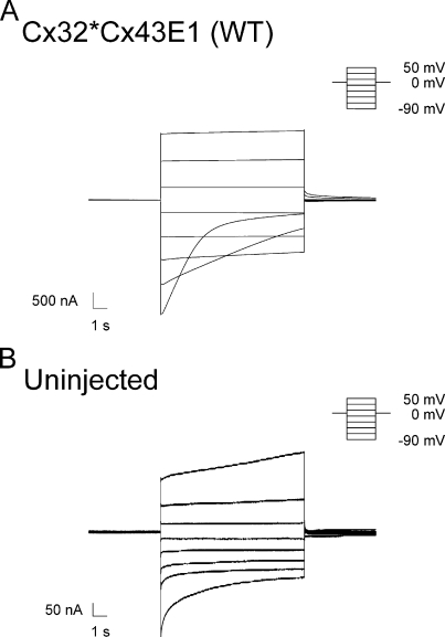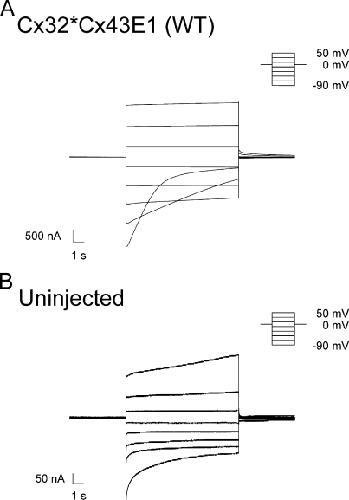 Figure 1. (A) Macroscopic current traces obtained from WT Cx32*Cx43E1 unapposed hemichannels after polarizations in 20-mV increments between −90 and 50 mV from a holding potential of 0 mV. The small increase in current level at large positive voltages results from the activation of an endogenous oocyte channel as assessed by recording uninjected oocytes. (B) Macroscopic current traces obtained from an uninjected oocyte illustrating typical endogenous currents present in oocytes obtained from Xenopus 1 frogs in Cs-MES bath solutions. There is variability in the form and magnitude of endogenous currents among oocytes, but in most cases endogenous currents contribute <300 nA.