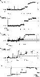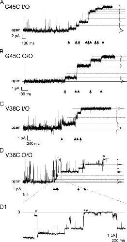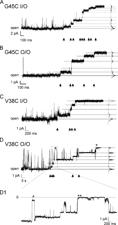 Figure 2. G45C and V38C residues are modified by MTSEA–biotin-X. Segments of patch clamp records of G45C and V38C after the addition of MTSEA–biotin-X to the bath solution at a final concentration of 1 or 0.5 mM. Arrows at the bottom of each panel mark step changes in conductance that are consistent with the reaction of a cysteine residue with MTSEA–biotin-X. Changes in current levels were determined with the all-point histograms shown on the right side of each panel. (A) Inside-out recording of two G45C channels. Nine conductance changes are evident, consistent with modification of 9 of 12 available G45C residues. The first modification event occurred 20 s after the bath application of 1 mM MTSEA–biotin-X. (B) Outside-out recording of a single G45C channel illustrating five conductance changes, consistent with modification of five of six available cysteine residues. The first modification event occurred 6 s after the bath application of 1 mM MTSEA–biotin-X. (C) Inside-out recording of a single V38C channel illustrating four conductance changes consistent with modification of four of six available subunits. The first modification event occurred 18 s after the bath application of 1 mM MTSEA–biotin-X. (D) Outside-out recording of a single V38C channel illustrating six conductance changes. It is not clear if the final conductance change, marked by an asterisk, resulted from a reaction, gating event, or channel loss; thus, at least five of six cysteine residues are modified. The first modification event occurred 64 s after the bath application of 0.5 mM MTSEA–biotin-X. The longer time to the first modification event correlates with the lower concentration of MTSEA–biotin-X used in this record (0.5 mM vs. 1.0 mM) than was used in the previous records. (D1) This is an enlargement of the boxed region of D. The event marked by the single asterisk is a Vj-gating transition that occurred after modification of two cysteine residues. The event marked by two asterisks is a loop-gating transition that occurred after three cysteine subunits were modified by MTSEA–biotin-X. Note that the loop- or slow-gating event involves a series of small amplitude transitions giving the appearance of a complex gating event with a measurable time constant, whereas the Vj-gating event occurs as a single fast step between the open state and a subconductance state. Zero current level indicated by the dashed line is the leak-subtracted current.