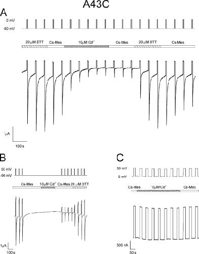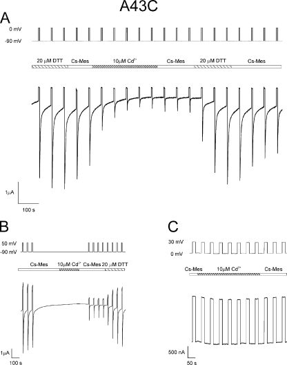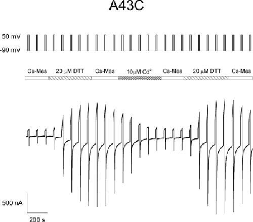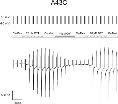 Figure 3. DTT and cadmium alter levels of A43C currents. Macroscopic currents elicited from an oocyte expressing A43C unapposed hemichannels with the voltage paradigm shown at the top of the panel. The central bar indicates the time and duration at which the bath solution containing 100 mM Cs-MES, 1.8 mM CaCl2, and 10 mM HEPES, pH 7.6, was exchanged with the same bath solution except containing either 20 µM DTT or 10 µM CdCl2. Currents increased to a steady-state level approximately fivefold greater than the initial currents after exposure to 20 µM DTT and decreased to ∼80% of maximum after treatment with 10 µM CdCl2. The reduction in current was not changed substantially by washing with the bath solution but was reversed to pre-cadmium levels after wash with 20 µM DTT.