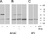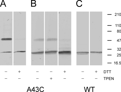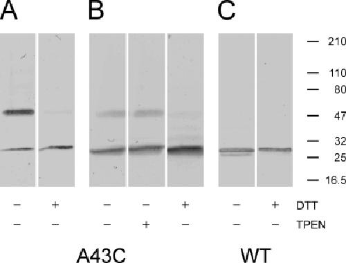Figure 4. Western blots of WT (Cx32*Cx43E1) and mutant (A43C) membrane-inserted hemichannels. + and − symbols at the bottom of each panel denote treatment of the sample with or without either 50 mM DTT or 10 mM TPEN before SDS-electrophoresis through 5–40% gradient polyacrylamide gels. The position of pre-stained molecular weight standards (Thermo Fisher Scientific) are presented as bars on the right side of the figure. The band with molecular weight ∼50 kD corresponds to a connexin dimer, whereas the monomer has an electrophoretic mobility comparable to a molecular weight standard of ∼27 kD. Only treatment with DTT reduces the dimer to the monomeric connexin form.